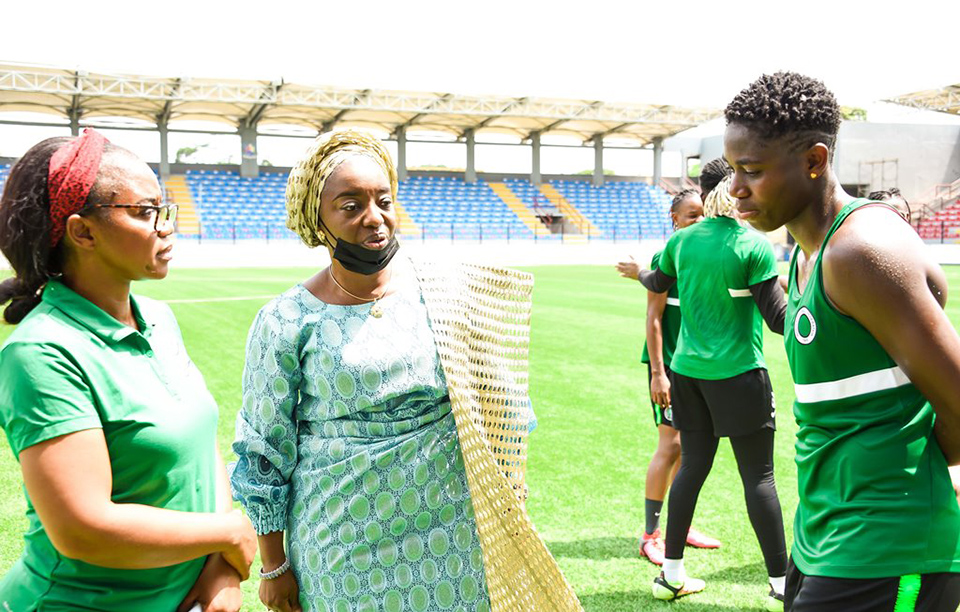 Lagos State First Lady, Dr. Ibijoke Sanwo-Olu, on Friday paid a visit to the Super Falcons during their training session at the Mobolaji Johnson Arena in Lagos ahead of their clash with the Black Queens of Ghana on Sunday at the Accra Sports Stadium.