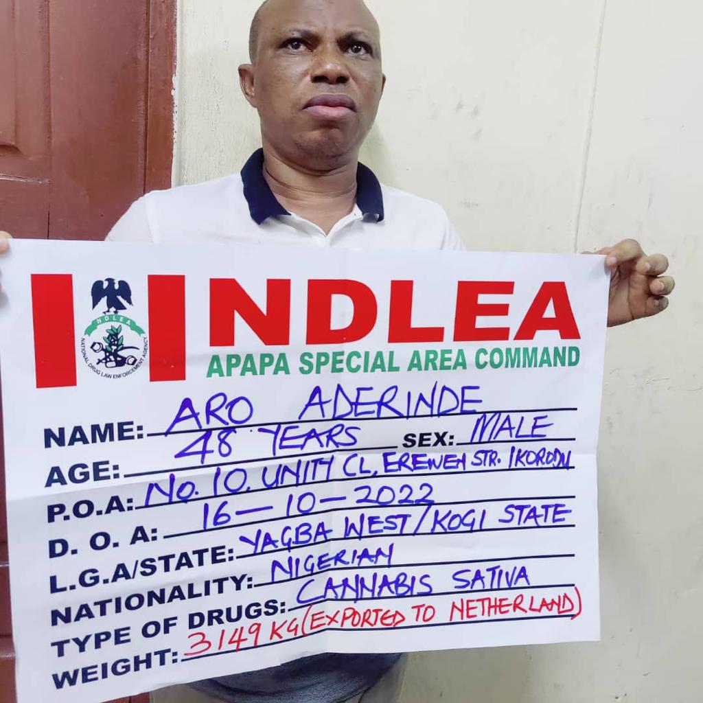Babafemi stated that the anti-narcotics officers, who have been on the trail of 48-year-old Aro Aderinde for weeks arrested him last Sunday in Lagos over his involvement in the export of 3,149kgs cannabis Sativa concealed in coconut fibres via container number MSKU 1820587.