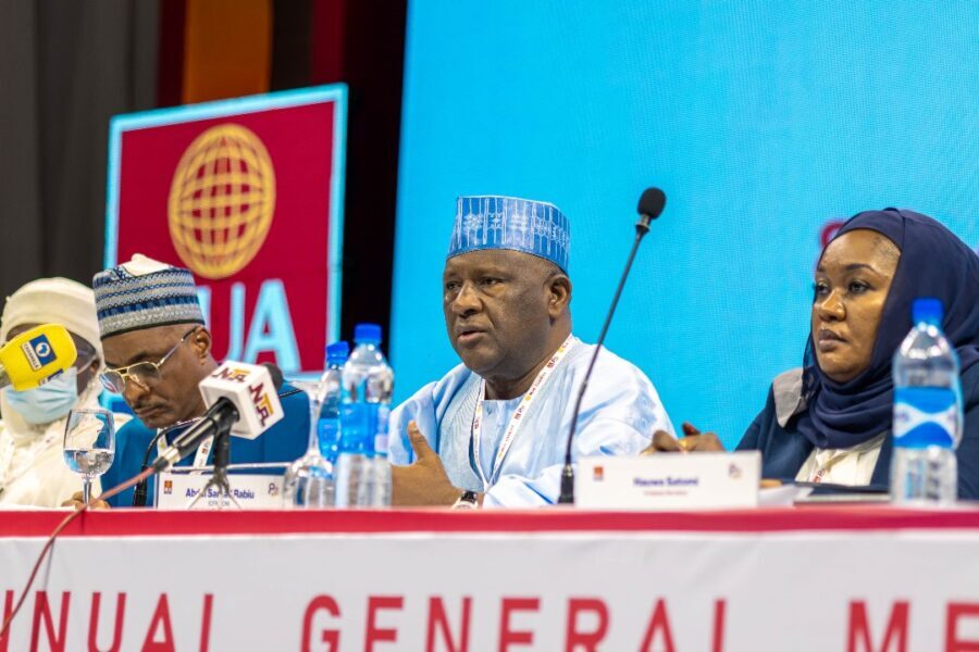 The narration for the image is as below: L-R: Yusuf Binji, Managing Director, BUA Cement Plc; Abdul Samad Rabiu (CFR, CON), Chairman, Board of Director, BUA Cement Plc and Hauwa Satomi, Company Secretary, BUA Cement Plc during the BUA Cement 8th Annual General Meeting in Abuja...on Thursday, August 29, 2024