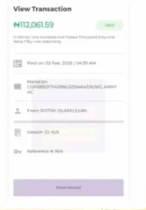 He presented three bank alerts as proof. The first, dated February 2, 2026, showed a credit of ₦112,061.59 referenced to “NIC-ARMY AC,” which he identified as his salary.