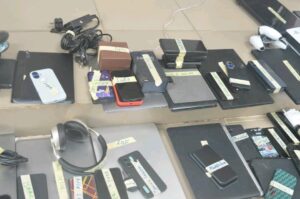 Recovered items include 15 iPhones, nine Samsung phones, three Redmi phones, one Infinix phone, two iPads, eight laptops, one Peugeot 406 vehicle, two PlayStation 4 consoles, one PlayStation 5, four Neonx Auto bikes, a Maxi E50KWH generator, and one pistol.