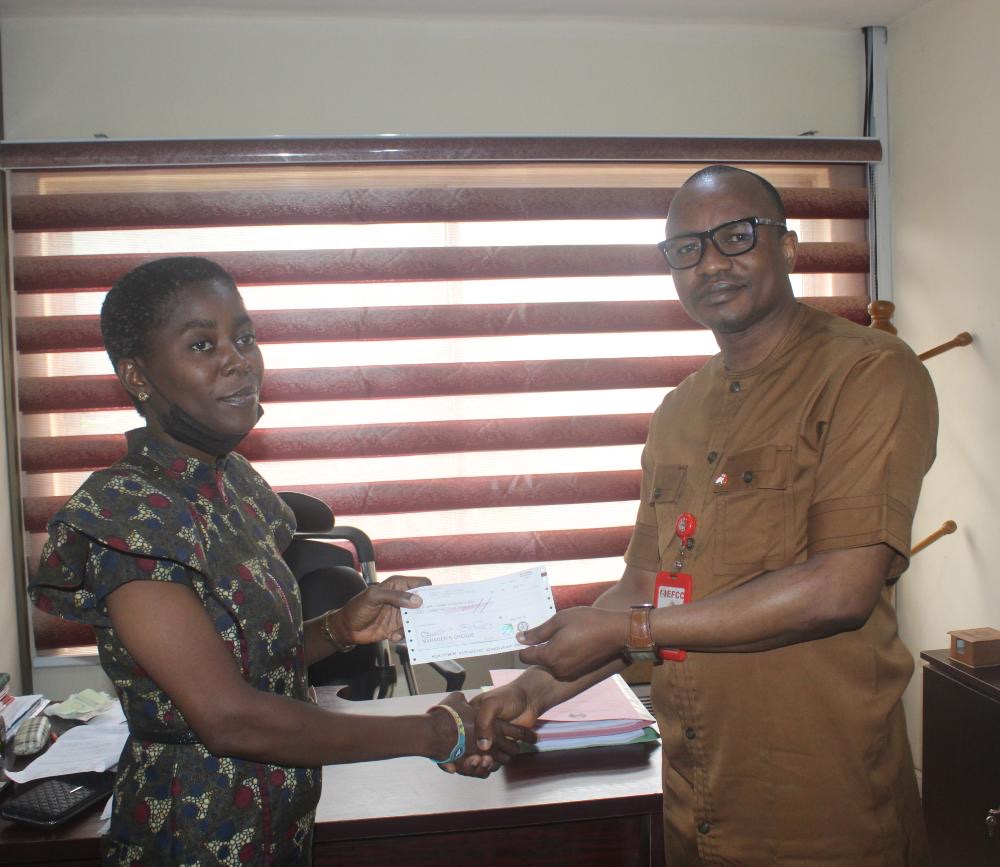 The bank draft was presented to her by the Assistant Commander of EFCC, Benin Zonal Command, Adesola Amusan.
