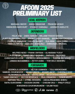Super Eagles head coach Eric Chelle has announced a 54-man provisional squad for the 2025 Africa Cup of Nations (AFCON) in Morocco.