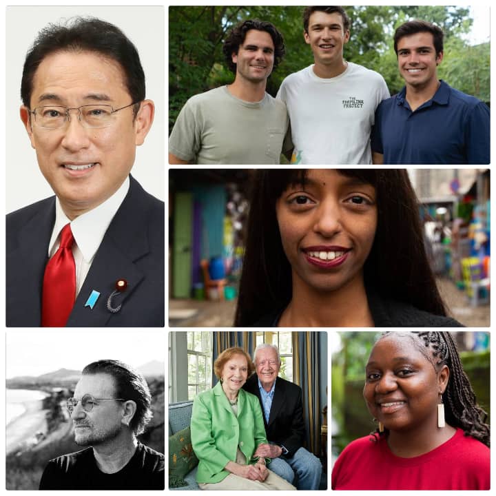 The awardees include Japan Prime Minister Fumio Kishida, former US President and First Lady Rosalynn and Jimmy Carter, Bono, and activists from Cameroon, Ethiopia, and the United States