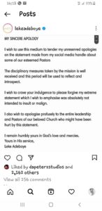 But Pastor Leke confirmed the disciplinary measures in a statement issued on Thursday wherein he apologised for his outburst.
