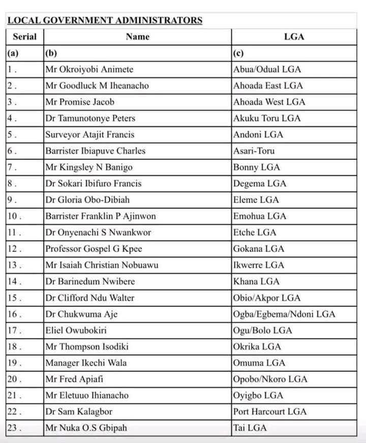 Rivers State Sole Administrator Vice Admiral Ibok-Ete Ibas (retd.) has appointed administrators for the 23 Local Government Areas of the state, hours after a Federal High Court in Port Harcourt, the state capital, declined to issue a restraining order.