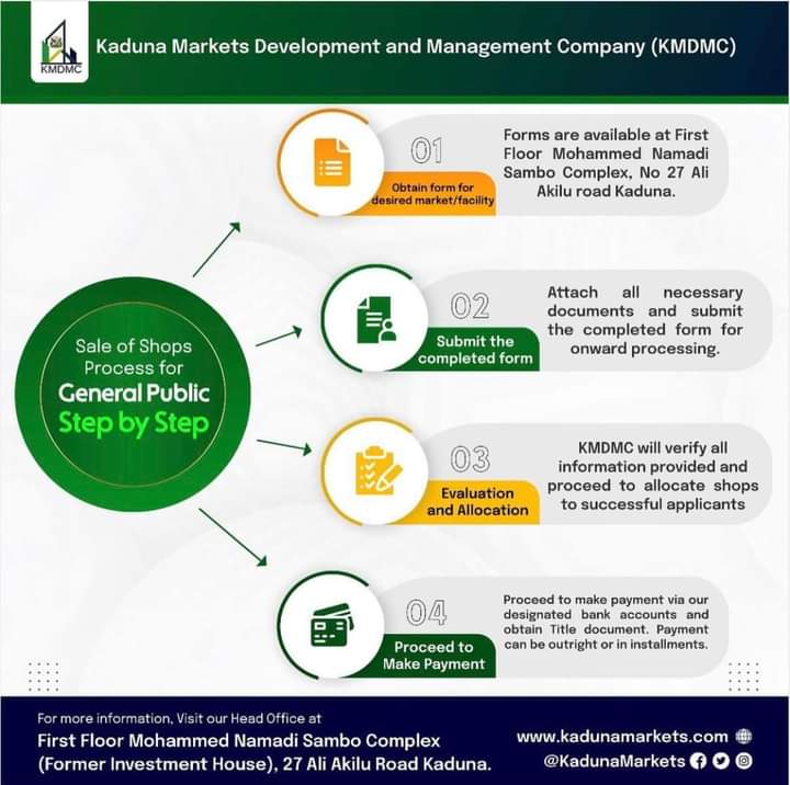 Interested persons are advised to purchase shops available at the following locations: Kawo Modern Market, Kawo, Kaduna North LGA; Ungwan Rimi Market, Doka, Kaduna North LGA; and Kasuwan Barci Market, Tudun Wada, Kaduna South LGA.