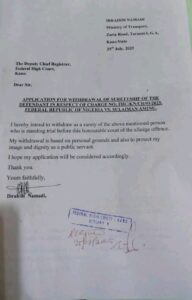 In a formal letter submitted to the Deputy Registrar of the court, Alhaji Namadi cited personal reasons for his decision, stressing the importance of protecting his personal integrity and the dignity of his office as a public servant.