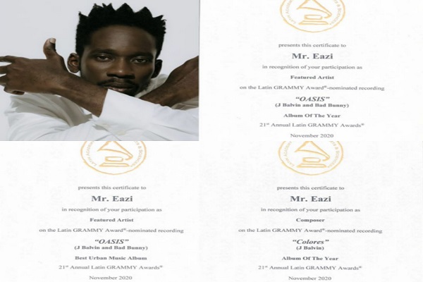 The certificates received by Mr Eazi were featured artiste on Oasis by JBalvin/ Bad Bunny for Album of the year 2020, featured artiste on Oasis by JBalvin/ Bad Bunny for Best Urban Album 2020, Composer on Colores Album of the year 2020, and Featured artiste on Colores by J Balvin – Best Urban Album (Winner) 2020.