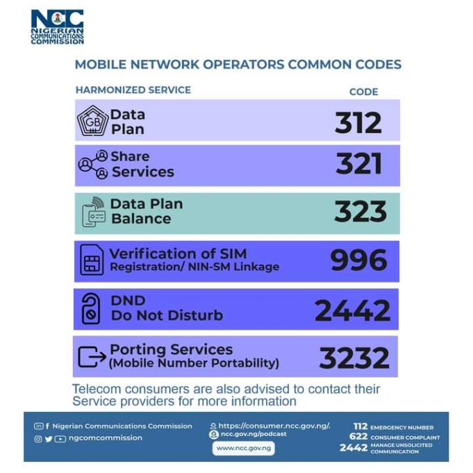 In line with the new direction, 321 is for Share Services, while 323 is for Data Plan Balance. The code, 996, is now for Verification of Subscriber Identity Module (SIM) Registration/NIN-SIM Linkage. The code, 2442, is retained for Do-Not-Disturb (DND) unsolicited messaging complaint management, while the common code, 3232, is also retained for Porting Services, otherwise called Mobile Number Portability.