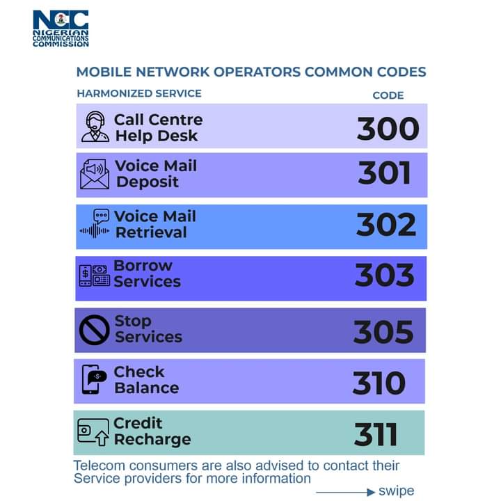 They include the following codes: 300 to be used as the harmonised code for Call Centre/Help Desk on all mobile networks; 301 for voice Mail Deposit; 302 for Voice Mail Retrieval; 303 for Borrow Services; 305 for STOP Service; 310 for Check Balance, and 311 for Credit Recharge.