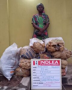 The NDLEA spokesperson disclosed that a 35-year-old female suspect, Bilikisu Salako, was nabbed with 108kgs of cannabis on Saturday, September 16, in the Ifo area of Ogun State.