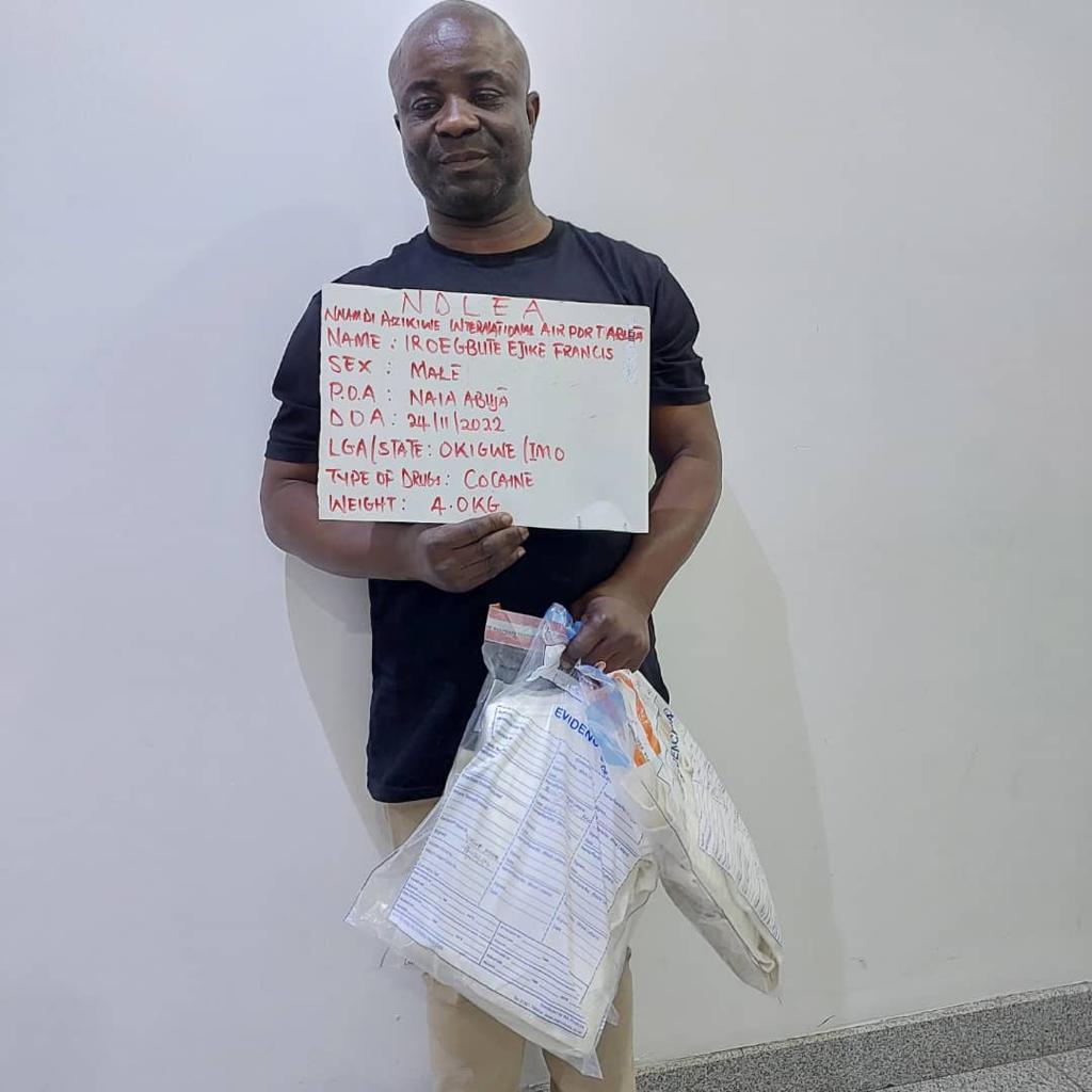 The NDLEA spokesperson added the move by a 46-year-old Brazilian returnee, Iroegbute Ejike Francis, to smuggle 4kg cocaine soaked in towels stuffed in his hand luggage into the country was foiled on Thursday by the officers of the anti-drug agency at the Nnamdi Azikiwe International Airport, Abuja.