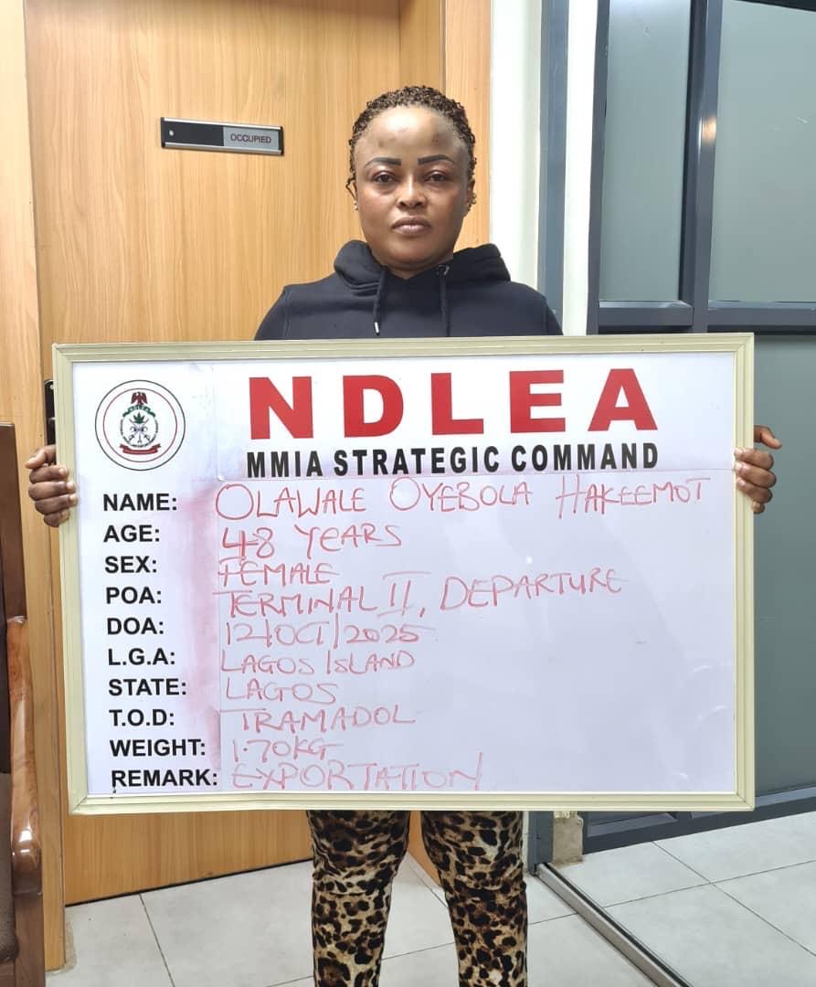 The NDLEA spokesman said Hakeemot was arrested at the departure hall of terminal 2 of the Lagos airport on Sunday, October 12, following the discovery of frozen snails used to conceal 2,300 pills of tramadol 225mg in her luggage while heading to Manchester, United Kingdom, on a Qatar Airways flight.