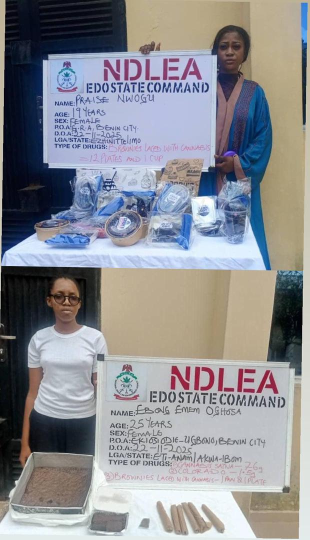 The two ladies — Praise Nwogu, 19, and Ebong Emem Oghosa, 25 — who allegedly specialise in the production and online sale of brownies laced with illicit drugs were arrested in Benin, the capital of Edo State, on Saturday, November 22, 2025.