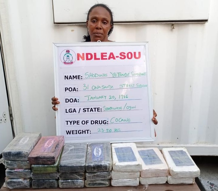 The operatives of the National Drug Law Enforcement Agency (NDLEA) have apprehended a woman, Shodunke Yetunde Simbiat, in her Lagos home, where 23.50 kilograms of cocaine worth over N5 billion were recovered from her children’s room.