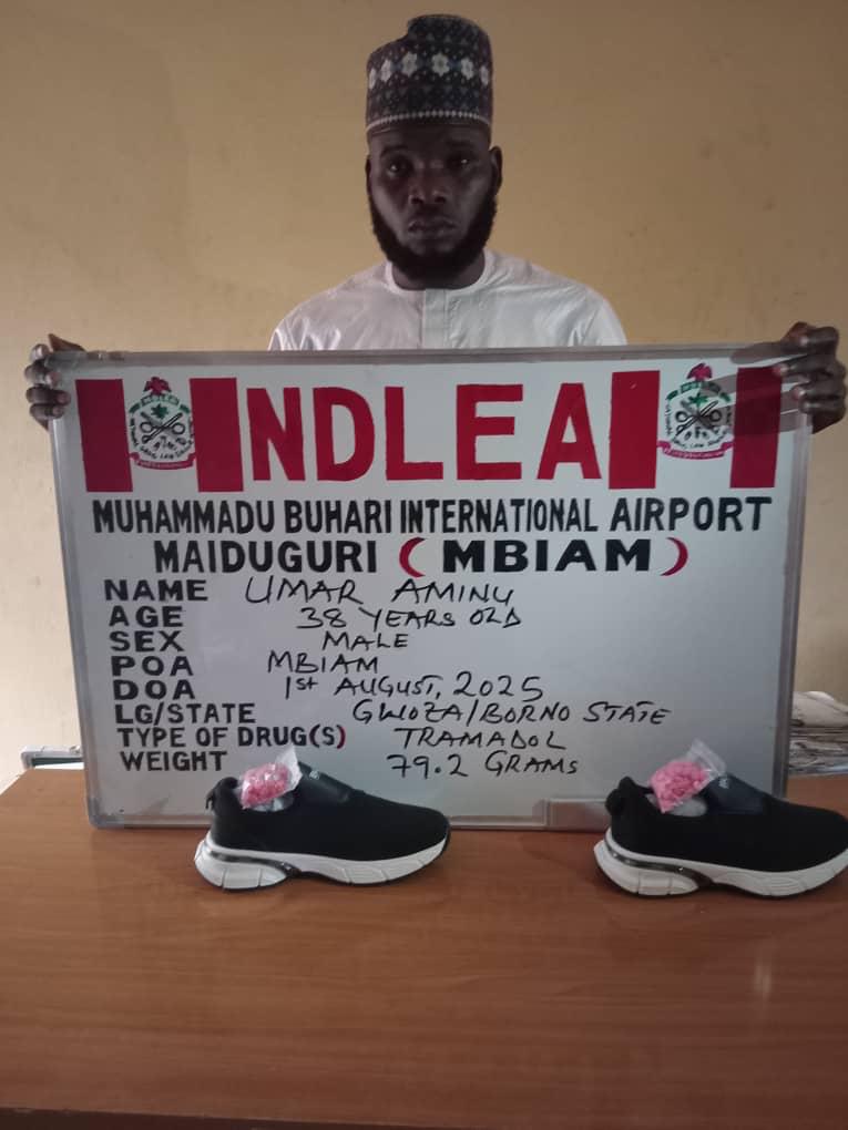 Babafemi revealed that a consignment of 160 pills of tramadol concealed in footwear by a 38-year-old passenger, Umar Aminu, was intercepted at the arrival hall of the Maiduguri airport on Friday, August 1.