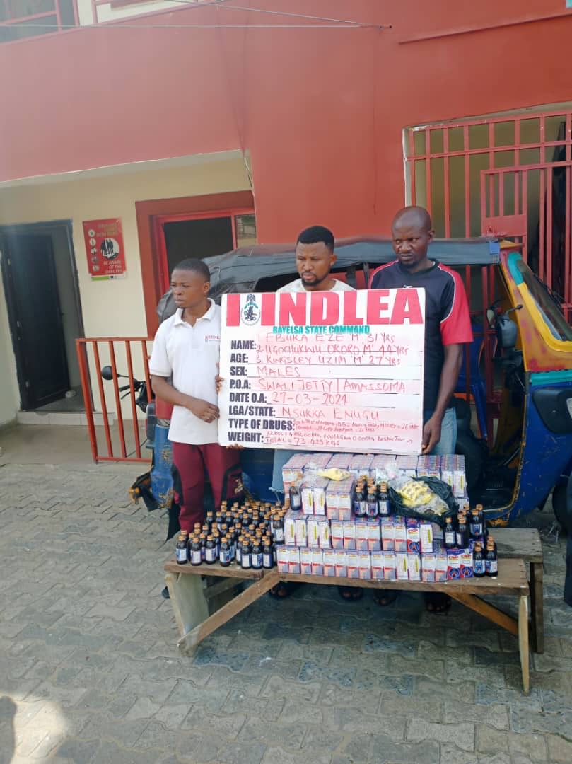 The operatives of the National Drug Law Enforcement Agency (NDLEA) have foiled an attempt by three suspects to smuggle opioids including codeine, molly, tramadol, and diazepam weighing 73.425 kilograms to the creeks in the Southern Ijaw area of Bayelsa State.