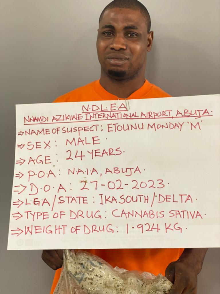 The operatives of the National Drug Law Enforcement Agency (NDLEA) have arrested a 24-year-old passenger travelling to Oman, Etounu Monday, at the Nnamdi Azikiwe International Airport in Abuja while attempting to export 1.924kg of skunk concealed in cream tubes.