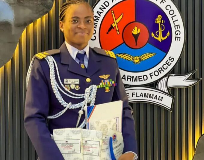 Flight Lieutenant Kafayat Sanni, Nigeria’s trailblazing first female fighter pilot, has added another milestone to her career by clinching top awards at the prestigious Ghana Armed Forces Command and Staff College (GAFCSC) in Accra.