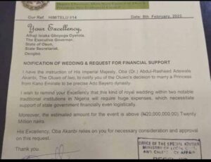 A stamp on the letter titled, ‘Notification of wedding and request for financial support’, showed it was received on behalf of Oyetola by the office of Special Adviser to the governor on Chieftaincy Affairs.