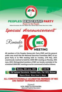 The NEC also ratified the composition of the committees for its upcoming National Convention scheduled for August 28 to 30, 2025. Governor Ahmadu Fintiri will chair the Convention Committee, with Governors Ademola Adeleke and Peter Mbah serving as vice chairman and secretary, respectively.