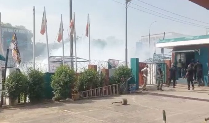 Tension escalated at the Peoples Democratic Party (PDP) National Secretariat in Wadata Plaza, Abuja, on Tuesday, November 18, 2025, as police officers fired teargas to break up clashes between rival factions and their supporters.