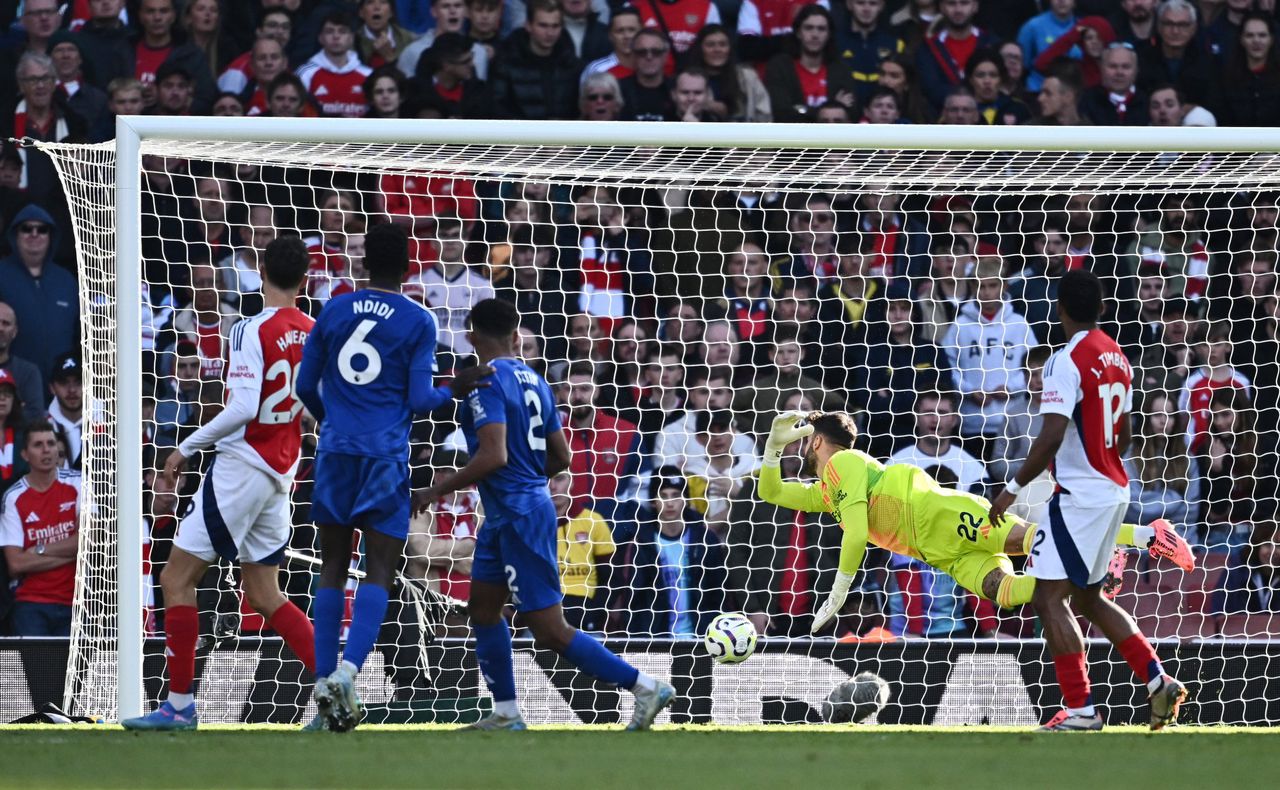 Arsenal then faced incredible resistance from Leicester goalkeeper Mads Hermansen as they bid to restore their two-goal cushion, as the shot-stopper clawed out Gabriel’s header from a corner and then the close-range rebound from Riccardo Calafiori.