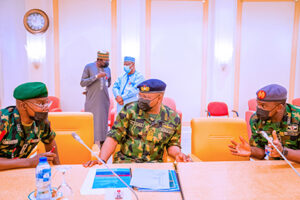 President Muhammadu Buhari receives security briefing from Service Chiefs at the State House, Abuja. October 21, 2021