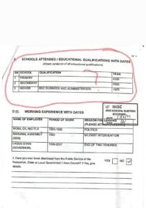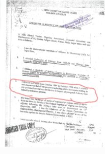 He stated: “I went on self exile from October 1994 to October 1999 (and) when I returned and discovered that my property including all the documents relating to my qualification and my certificates in respect of paragraph 3 above were looted by unknown persons.”