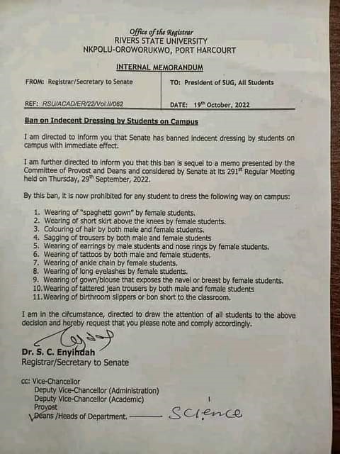 The registrar said the Senate of RSU took the decision to ban the indecent dressing on campus at its meeting of September 29.