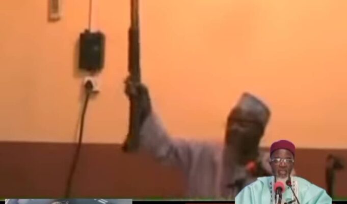 In the two-minute clip circulating online, Sheikh Yabo is seen holding a gun and addressing his congregation on the need for personal protection in the face of escalating insecurity in the region.