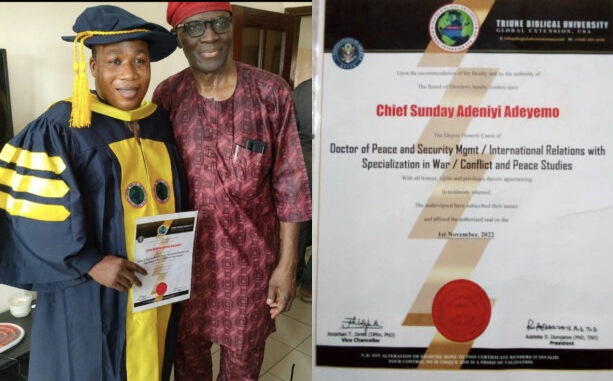 The Triune Biblical University in New York, United States, has conferred the Yoruba Nation agitator, Sunday Adeyemo, well known as Sunday Igboho, with an honorary doctorate degree in war and peace studies.