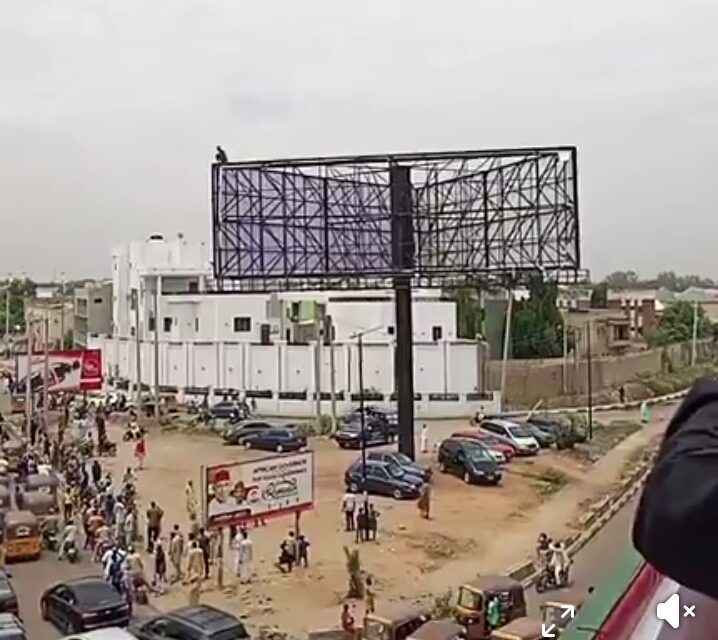 A tense scene unfolded in Kano as a teenager, believed to be around 17 or 18 years old, climbed a tall billboard near the Gadar Lado bridge, demanding the presence of Governor Abba Kabir Yusuf before he would come down.