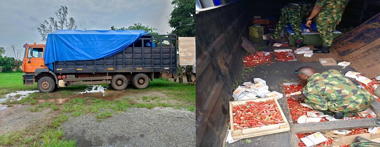 The Director, Army Public Relations, Brig. -Gen. Onyema Nwachukwu, who made this known in a statement on Monday, said the truck was loaded with 720 packets of Red Star Cartridges of 12 Calibre containing 25 cartridges per packet, totalling 18,000 cartridges, and an additional 250 packets of live (black) cartridges containing 10 packets each, totalling 2500 cartridges of same calibre.