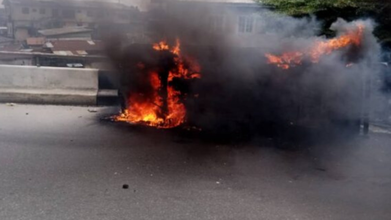 A car was gutted by fire on the Third Mainland Bridge in Lagos State on Tuesday, October 28, 2025.