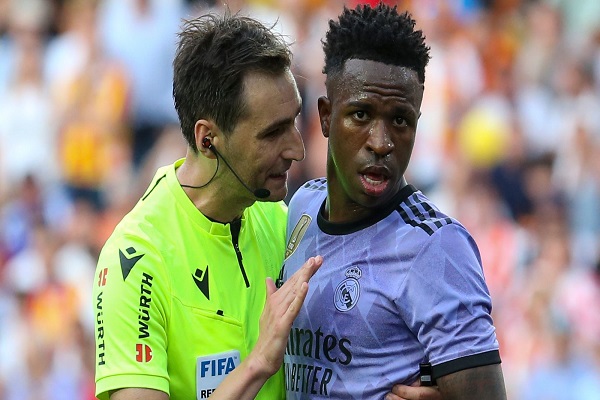 The Brazilian winger was sent off in stoppage time by referee Ricardo de Burgos Bengoetxea for striking an opponent following a scuffle with Valencia players in which Vinicius appeared to be grabbed around the neck.